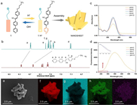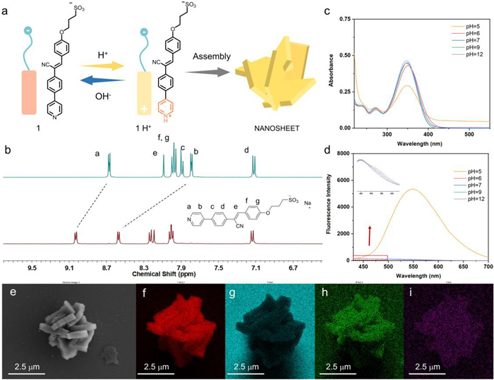 | Fig. 2. pH-dependent molecular assembly. (a) A schematic illustration of the pH-controlled assembly process. (b) 1H NMR (DMSO-d6) spectra of compound 1 (5 mmol/L) prior (green line) and after (red line) addition of hydrochloric acid. (c) UV–vis absorption spectra of the compound 1 in aqueous solutions under different pH values. (d) The fluorescence spectra of compound 1 aqueous solutions under different pH values. (e) SEM images of nanosheet assemblies and corresponding elemental mapping images of (f) carbon, (g) oxygen, (h) nitrogen, and (i) sulfur elements. | |