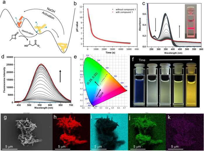 | Fig. 3. Time-dependent molecular assembly. (a) A schematic illustration of the time-dependent assembly process. (b) Influence of the compound on pH changes of the solution after adding 0.15 mmol β-butyrolactone (stirring rate: 300 r.p.m.). Time-dependent (c) UV–vis absorption and (d) fluorescence spectra of compound 1 in aqueous solutions after introducing 0.24 mmol β-butyrolactone (initial pH 12, stirring rate: 300 r.p.m.). (e) Time-dependent CIE coordinate diagram corresponding to d, showing the fluorescent color change from blue to yellow with time. (f) A series of fluorescent images of the time-dependent multicolor fluorescence. (g) SEM images of nanosheet assemblies and corresponding elemental mapping images of (h) carbon, (i) oxygen, (j) nitrogen, and (k) sulfur elements. | |