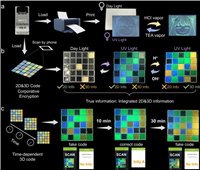 | Fig. 4. Dynamic information encryption materials. (a) Schematic representations for the printing experiment using colorless compound 1 solution as ink and fluorescence images of the printing pattern before and after treatment with acid/base. (b) Schematic representations for the integration of 2D codes and fluorescent 3D code and a series of codes under different conditions. (c) Schematic representations and photographs of the time-dependent 3D codes. | |