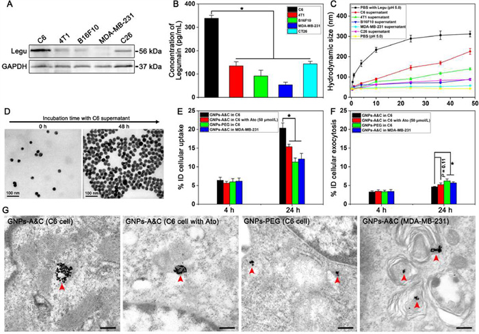 | Fig. 1. Evaluation of legumain responsiveness. (A) WB analysis of legumain expressed by different cells. GAPDH was served as a control. (B) ELISA analysis of the concentration of legumain in supernatant from different cells. (C) Hydrodynamic size of GNPs-A&C after resuspended in different cell supernatant at different time intervals, GNPs-A&C incubated in pH 5.0 PBS with or without legumain were served as controls (n = 3). (D) TEM images of GNPs-A&C in C6 cell supernatant after 48 h incubation, scale bar: 100 nm. ICP-MS analysis of intracellular gold content in C6 cells (E) and in supernatant (F) after treatment with different formulations (n = 3). (G) TEM images of cells treated with different formulations, red arrows indicate GNPs aggregates, scale bar: 200 nm. All data were represented as mean ± standard deviation (SD). *P < 0.05. | |