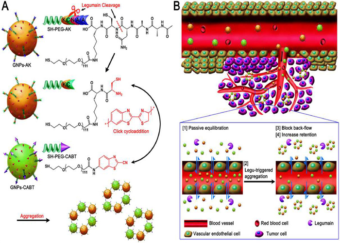 | Scheme 1. (A) Schematic diagram of construction and mechanism of legumain-induced aggregation. (B) Schematic diagram of mechanism of GNPs-A&C in enhancing intratumoral retention. | |