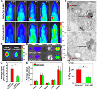 | Fig. 2. Evaluation of in vivo biodistribution. (A) Living imaging of subcutaneous C6 tumor-bearing mice injected with GNPs-Cy5.5-A&C and GNPs-Cy5.5-PEG. Ex vivo imaging of tumors (B) and normal tissues (D) from mice at 24 h post-injection with GNPs-Cy5.5-A&C and GNPs-Cy5.5-PEG. Quantitative analysis of fluorescence intensity from tumors (C) and normal tissues (E) from ex vivo imaging. (F) TEM images of C6 tumor slice treated with GNPs-A&C and GNPs-PEG at 24 h post-injection, scale bars: 200 nm. (G) ICP-MS analysis of gold content within tumor at 24 h post-injection with GNPs-A&C and GNPs-PEG (n = 3). All data were represented as mean ± SD. *P < 0.05. | |