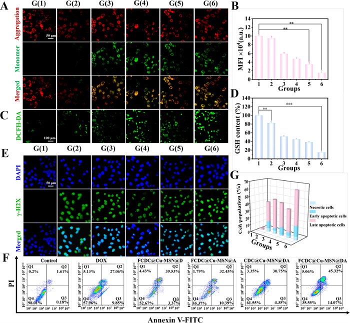 | Fig. 2. (A) CLSM images of the mitochondrial membrane potential stained with JC-1 probe in 4T1 cells after different treatments. Scale bar: 50 µm. (B) The semiquantitative analysis of the fluorescence intensity of aggregation of 4T1 cells. (C) CLSM images of 4T1 cells stained with DCFH-DA probe showing the GSH level and (D) the semiquantitative analysis of intracellular GSH content after different treatments. Scale bar: 100 µm. (E) CLSM images of DNA damage of 4T1 cells treated with different formulations. (F) Flow cytometry assay of 4T1 cells after different treatments. Scale bar: 50 µm. (G) Population of early apoptotic, late apoptotic and necrotic 4T1 cells induced with various treatments. G(1): PBS; G(2): DOX; G(3): FCDC@Cu-MSN@D; G(4): FCDC@Cu-MSN@A; G(5): CDC@Cu-MSN@DA; G(6): FCDC@Cu-MSN@DA. Data are presented as mean ± SD (n = 4). **P < 0.01, ***P < 0.001. | |