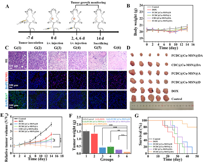 | Fig. 3. In vivo anti-tumor effect (n = 6 per group). (A) Schematic illustration of tumor model establishment and treatment process. (B) The biocompatibility was evaluated by body weight changes with different treatments as a function of time. (C) Photos of mice at the end of the experiment, and H&E, TUNEL, and Ki-67 staining of the tumor slices with different treatments after 14 days. Scale bar: 100 µm. (D) Photographs of the resected tumors on the 14th day. (E) Tumor volumes and (F) tumor weight after various treatments. (G) Survival rate of BALB/c mice bearing 4T1 tumor with different treatments. G(1): PBS; G(2): DOX; G(3): FCDC@Cu-MSN@D; G(4): FCDC@Cu-MSN@A; G(5): CDC@Cu-MSN@DA; G(6): FCDC@Cu-MSN@DA. Data are shown as mean ± SD (n = 5). P-values were calculated using one-way ANOVA with Tukey's post-hoc test, ns means no significance. **P < 0.01, ***P < 0.001. | |
