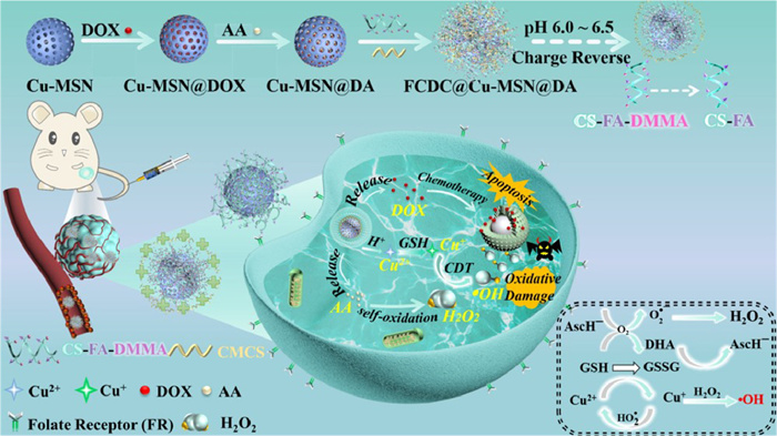Herein, a Cu(Ⅱ)-doped MSNs is developed for enhanced chemodynamic therapy (Scheme 1). DOX and AA are loaded into Cu-MSN, which is further modified with folate acid (FA) functionalized chitosan-maleic anhydride (FA-CS-DMMA) to endow them with prolonged blood circulation and active-transporting ability. Then, the negatively charged hydrophilic chain segment carboxymethyl chitosan (CMC) is coated to endow them with charge reversal ability, resulting in a kind of versatile nanoagents FA-CS-DMMA/CMC@Cu-MSN@DOX/AA(FCDC@Cu-MSN@DA). The resultant FCDC@Cu-MSN@DA can efficiently deliver cargoes into tumor cells by FA active-transporting and charge reversal ability. When FCDC@Cu-MSN@DA reached the tumor tissue, the carboxyl group of CMC was protonated, and the β-carboxylic acid amide bond between DMMA and CS (CS-DMMA) was breaking under the tumor extracellular microenvironment (pH 6.8). Then, the surface charge of nanoagents inverted from negative to positive, which increased the intracellular uptake. The acidic intracellular microenvironment triggered the biodegradation of Si-O-Cu, which accelerated the self-oxidation process of AA to provide more exogenous H2O2. Meanwhile, the release of Cu2+ was reduced to Cu+ by GSH, followed by Fenton-like reaction with exogenous H2O2 to produce more toxic hydroxyl radicals (•OH), resulting in serious oxidative damage to tumor cells. The in vitro and in vivo experiments suggested FCDC@Cu-MSN@DA can efficiently inhibit the growth of breast cancer via chemo/chemodynamic combination therapy by enhancing oxidative damage.