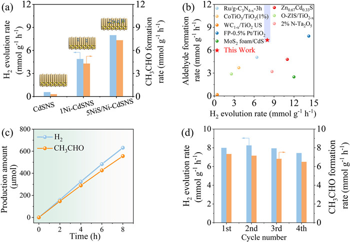 | Fig. 2. (a) Photocatalytic performance of H2 evolution integrated with selective ethanol oxidation. (b) Comparison of synergistic H2 evolution and alcohols oxidation by photocatalytic method (Table S2 in Supporting information for details). (c) Generation of H2 and acetaldehyde photocatalyzed by 5NiS/Ni-CdSNS as a function of reaction time. (d) Stability tests over 5NiS/Ni-CdSNS. | |
