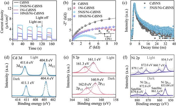 | Fig. 3. (a) Transient photocurrent and (b) electrochemical impedance spectroscopy (EIS) spectra of CdSNS and obtained composites. (c) Time-resolved PL spectra of CdSNS and 5NiS/Ni-CdSNS composite. In situ XPS spectra of (d) Cd 3d, (e) S 2p, and (f) Ni 2p for the 5NiS/Ni-CdSNS. | |