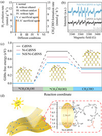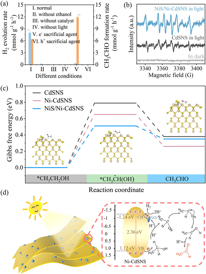 | Fig. 4. (a) The photocatalytic performance of H2 evolution integrated with ethanol oxidation under different conditions. (b) ESR spectra of CdSNS and NiS/Ni-CdSNS with the addition of DMPO. (c) Calculated energy profile for ethanol oxidative dehydrogenation and acetaldehyde production on CdSNS, Ni-CdSNS, and NiS/Ni-CdSNS. The reaction structure diagram in the figure shows the reaction structure diagram of ethanol on the NiS/Ni-CdSNS surface. (d) Schematic diagram of photocatalytic H2 evolution integrated with acetaldehyde synthesis. | |