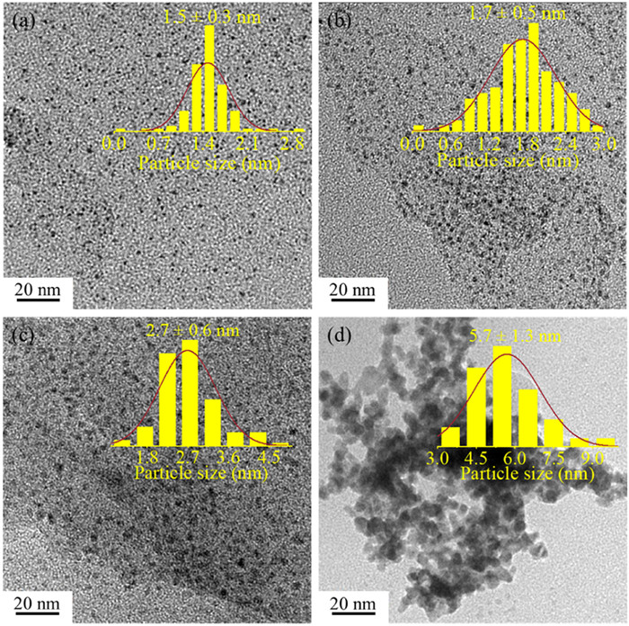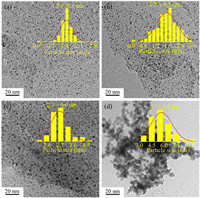 | Fig. 1. TEM images of (a) PdAu/ArGO, (b) Pd/ArGO, (c) PdAu/rGO, and (d) PdAu NPs. The insets show the corresponding particle size distributions. | |