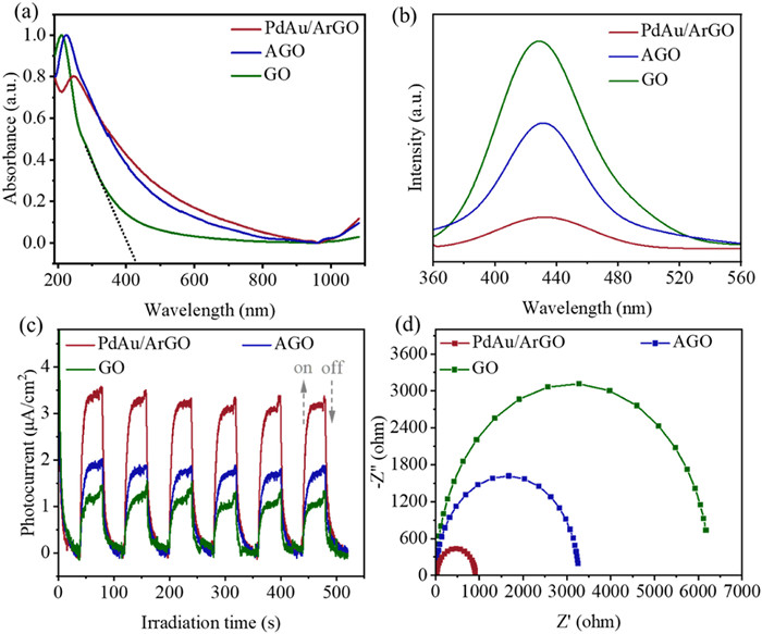 The photoabsorption properties of different samples were studied by UV–vis absorption spectroscopy. As presented in Fig. 2a, GO exhibits weak visible light absorption. After amino modification, the range of light absorption of GO is broadened from UV to visible region, which indicates that effective amino modification can significantly expand the light absorption range of GO and facilitate the absorption and utilization of light energy by the catalyst. Moreover, it can be easily observed that PdAu/ArGO has good absorption of visible light. The separation and transfer efficiency of photogenerated charge carriers in different samples were analyzed by static photoluminescence (PL) spectroscopy and photocurrent density measurements. As shown in Fig. 2b, the intensity of the PL emission peak of GO is greatly weakened by the introduction of amino modification, suggesting a faster charge transfer in AGO compared to GO. Especially, the intensity of the AGO emission peak decreases significantly after the formation of the metal catalyst. This suggests that the metal-semiconductor heterojunction structure constructed between metal NCs and ArGO significantly suppresses the radiative recombination of photogenerated charge carriers through the Mott–Schottky effect [29,30]. In this structure, electrons transfer from the ArGO to metal NCs, as confirmed by XPS (Fig. S6). Moreover, PdAu/ArGO shows the highest photocurrent density under visible light irradiation compared with other samples (Fig. 2c). The photocurrent density of PdAu/ArGO is about 1.8 times higher than that of AGO, indicating that the photogenerated charge carriers may be rapidly separated by electron transfer from ArGO to PdAu NCs, which is consistent with the PL results. In addition, electrochemical impedance spectroscopy (EIS) measurements show that the charge transfer resistance is in the order of GO > AGO > PdAu/ArGO (Fig. 2d). The small charge transfer resistance of PdAu/ArGO suggests that electrons can be easily transferred from the surface of the catalysts to the reactants or the acceptors of the photogenerated electrons, which improves the efficiency of the catalytic reaction. Based on the aforementioned results, it is expected that PdAu/ArGO will exhibit significantly enhanced catalytic activity toward FAD under visible light, which can be immediately evidenced by subsequent catalytic results.