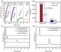 | Fig. 3. (a) Volume of generated gas (H2 + CO2) versus time for FAD over different catalysts under light and dark at 298 K. (b) The corresponding TOF values. GC spectra using (c) TCD detector and (d) FID-methanator for the commercial gas and the generated gas from FAD over PdAu/ArGO under light at 298 K. | |