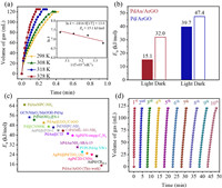 | Fig. 4. (a) Volume of generated gas (H2 + CO2) versus time for FAD over PdAu/ArGO under light at different temperatures. The inset shows the corresponding Arrhenius plot. (b) The apparent activation energy of different catalysts. (c) Comparison of the apparent activation energy of our PdAu/ArGO catalyst with other reported catalysts. (d) Durability test for FAD over PdAu/ArGO under light at 298 K. | |
