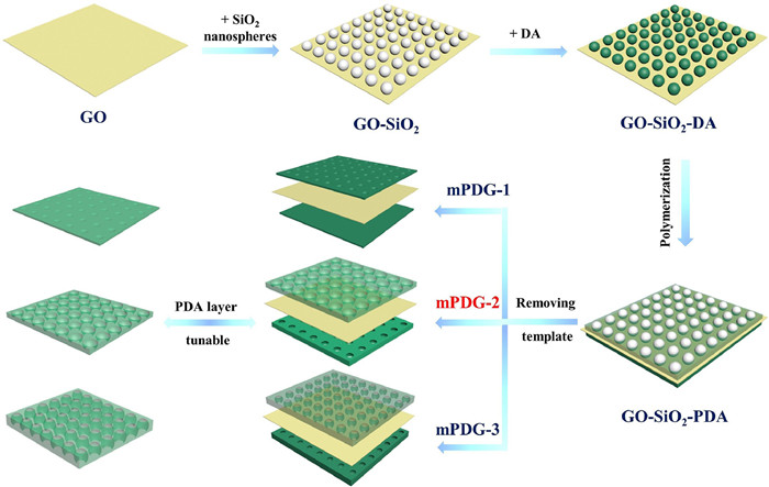 | Fig. 1. Illustration of the fabrication of 2D mPDG heterostructures with tunable thickness and mesopore structure. | |