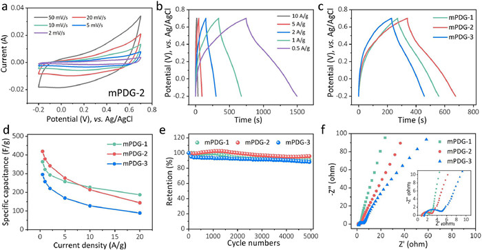 | Fig. 3. Electrochemical performance of 2D mPDG working in a three-electrode system. (a) CV curves at 2–50 mV/s, and (b) GCD profiles at 0.5–10 A/g for mPDG-2. (c) GCD profiles measured at 1 A/g, (d) specific capacitances at varying current densities, (e) cycling stability over 5000 cycles at 1 A/g, and (f) EIS plots (inset: magnified high-frequency region) of mPDG-1, mPDG-2 and mPDG-3. | |