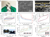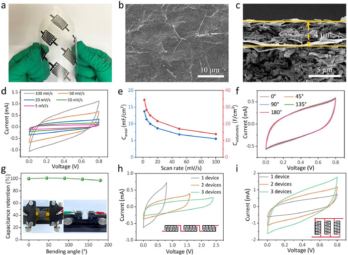 | Fig. 4. Characterization and electrochemical performance of mPDG-HMSCs. (a) Photograph at a bending state, (b) top-view SEM image, and (c) cross-section SEM image of mPDG-based microelectrodes. (d) CV curves at 5–100 mV/s, (e) areal capacitance and volumetric capacitance versus scan rate of mPDG-HMSCs. (f) CV curves at 50 mV/s, and (g) capacitance retention of mPDG-HMSCs under varying bending angles of 0°−180° (insets: photographs of the device at 0° and 180°). (h, i) CV curves at 50 mV/s of three connected mPDG-HMSCs in (h) series and (i) parallel. | |