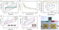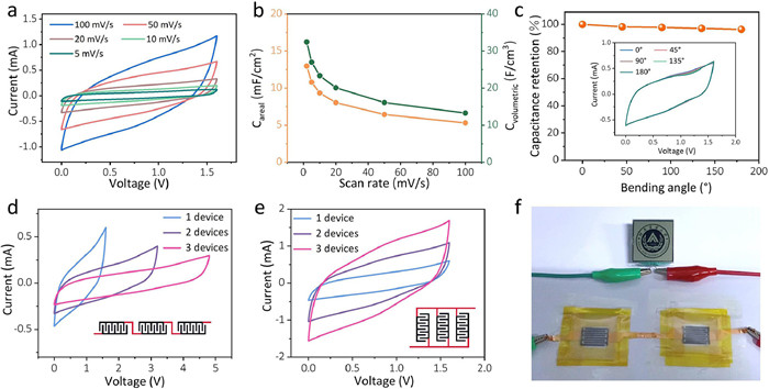 | Fig. 5. Electrochemical performance of mPDG-LMSCs. (a) CV curves, (b) areal capacitance and volumetric capacitance versus scan rate of mPDG-LMSCs. (c) Capacitance retention versus bending angle for mPDG-LMSCs (Inset: CV curves at 50 mV/s). (d, e) CV curves of three connected mPDG-LMSCs in (d) series and (e) parallel. (f) Photograph of the logo of "Henan Agricultural University" powered by two serially-connected mPDG-LMSCs. | |