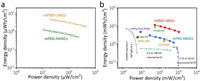| Fig. 6. Ragone plot of mPDG-HMSCs and mPDG-LMSCs. (a) Areal energy density and power density, and (b) volumetric energy density and power density of mPDG-HMSCs and mPDG-LMSCs with recently reported polymer/graphene-based MSCs and commercially available energy storage devices. | |