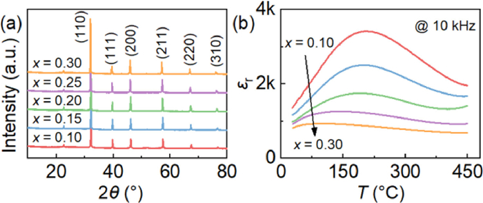 The (1-x)BNT-xSZMN (x = 0.10, 0.15, 0.20, 0.25, 0.30) ceramics were synthetized by solid state reaction. The crystal structure of (1-x)BNT-xSZMN ceramics was detected by X-ray diffraction (XRD), as displayed in Fig. 1a. The pure perovskite structure for all samples is identified by the typical diffraction peaks, suggesting the introduced dopants have successfully diffused into BNT matrix. The microstructure obtained via scanning electron microscope (SEM) are provided in Fig. S1 (Supporting information). All the samples show dense microstructure. With increasing x, the grain size decreases obviously, which is advantageous to achieve high Eb.
