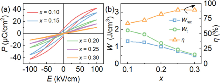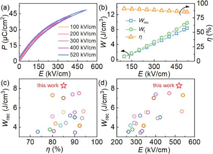 Based on the evolution of Pmax, Pr and Pmax-Pr, the Wrec and Wt of the x = 0.25 sample increase monotonically with increasing electric field, while the η gradually decreases, as plotted in Fig. 3b. At the highest applied electric field, the Wrec, Wt and η achieve 8.3 J/cm3, 9.8 J/cm3 and 85%, respectively. Notably, besides the large value of Pmax-Pr, the endurance for high electric field up to 520 kV/cm also facilitates obtaining ultrahigh energy density.