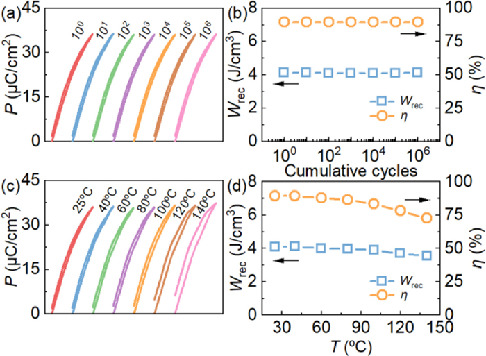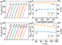 | Fig. 4. (a, b) Anti-fatigue and (c, d) thermal reliability of energy storage properties for the x = 0.25 sample. | |