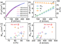 | Fig. 3. (a) Electric field dependent unipolar P-E loops of the x = 0.25 sample, and (b) corresponding Wrec, Wt, η. Comparison of (c) Wrec and η, and (d) Wrec and E between the x = 0.25 sample and other BNT-based ceramic capacitors. | |