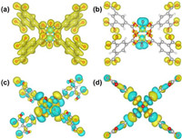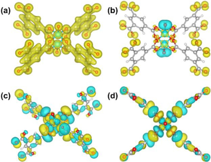 | Fig. 2. The charge density (Isosurface level = 0.13), (b) spin density (Isosurface level = 0.01), (c) SOMO, and (d) SOMO-1 of HKUST-1. Color scheme: Cu, cyan; O, red; C, gray; H, white. | |