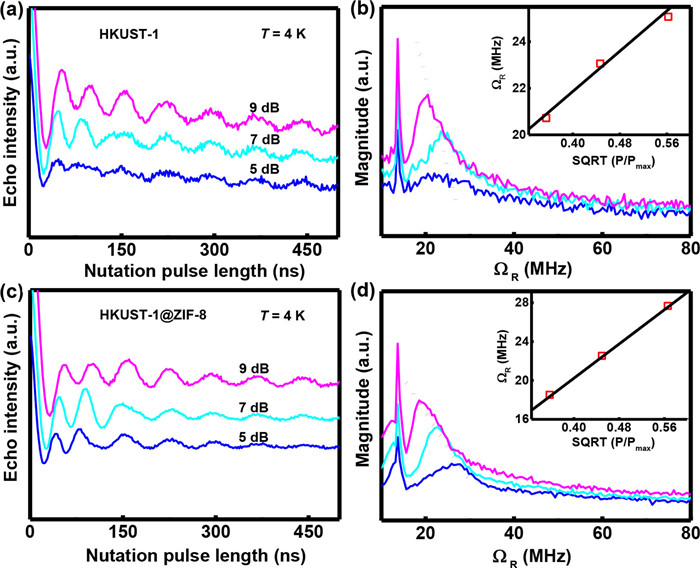 | Fig. 4. Rabi oscillations were measured at 4 K for (a) HKUST-1 and (c) HKUST-1@ZIF-8 with various microwave attenuations. The Fourier transforms of (b) HKUST-1 and (d) HKUST-1@ZIF-8 of the Rabi oscillations. | |