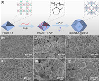 | Fig. 1. (a) Schematic illustration of the fabrication process of the HKUST-1@ZIF-8. SEM images of (b) ZIF-8, (c) HKUST-1, and (d) HKUST-1@ZIF-8, whereas (e-g) are enlarged versions of (b-d), respectively. | |