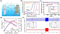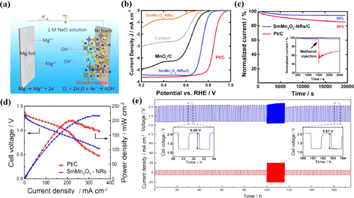 | Fig. 10. (a) Schematic of a primary Mg-air battery using mixed-mullite catalyst in oxygen cathode, Mg anode, and aqueous 1 mol/L NaCl electrolyte. Reproduced with permission [11]. Copyright 2016, Elsevier. (b) LSV curves of oxygen reduction on pure SmMn2O5, carbon, MnOx/C, SmMn2O5-NRs/C and Pt/C in O2-saturated 0.1 M KOH at a rotating speed of 1600 rpm with a scan rate of 5 mV/s. Reproduced with permission [39]. Copyright 2017, Royal Society of Chemistry. (c) Chronoamperometric curves of SmMn2O5-NRs/C and Pt/C at a constant potential of 0.6 V vs. the RHE. Reproduced with permission [39]. Copyright 2017, Royal Society of Chemistry. (d) Typical polarization curves and the corresponding power density plots of the batteries made with SmMn2O5-NRs and Pt/C. Reproduced with permission [82]. Copyright 2018, Elsevier. (e) Cycling test of the ZAB made with SmMn2O5-NRs at different charging-discharging current density. Reproduced with permission [82]. Copyright 2018, Elsevier. | |