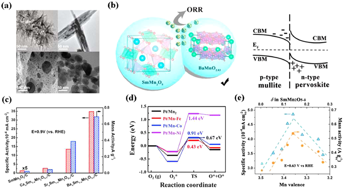 | Fig. 11. (a) SEM images of SmMn2O5 samples. Reproduced with permission [64,71,84,85]. Copyright 2017, Royal Society of Chemistry; Copyright 2021, Elsevier; Copyright 2018, Elsevier; Copyright 2021, Elsevier. (b) The schematic diagram of the interface effect: mullite (SmMn2O5)/O-deficient perovskite (BaMnO2.83). Reproduced with permission [29]. Copyright 2018, Elsevier. (c) Specific and mass activities at the potential of 0.9 V (vs. RHE). Reproduced with permission [29]. Copyright 2018, Elsevier. (d) Energetic routes of O2 adsorption and dissociation on the Mn2 dimer and Mn-X heterodimers at the interface of Pt20/SMO. The corresponding barrier energies of O2 dissociation have been labeled. Reproduced with permission [92]. Copyright 2019, Royal Society of Chemistry. (e) Specific activities (left) and mass activities (right) as a function of Mn valence state and δ value in SMO5-δ at 0.63 V (vs. RHE). Reproduced with permission [89]. Copyright 2020, Elsevier. | |