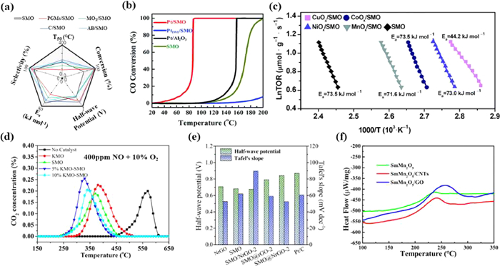 | Fig. 12. (a) A comparison chart of the performance improvement of different materials composited with SmMn2O5 (SMO). PGMs, MOx, C and AB represent platinum group metals, metal oxides, the highly conductive material, and acidic or basic materials, respectively. (b) CO conversion of Pt/SMO, PtIWI/SMO, Pt/Al2O3 and SMO as a function of reaction temperature. Reproduced with permission [90]. Copyright 2018, Royal Society of Chemistry. (c) Apparent activation energy Ea of the MOx/SMO samples. Reproduced with permission [91]. Copyright 2018, Royal Society of Chemistry. (d) Soot combustion with NOx-assisted. Reproduced with permission [93]. Copyright 2020, Elsevier. (e) Half-wave potential and Tafel’s slope of SMO, NrGO, SMO/NrGO-2, SMO@rGO-2, SMO@NrGO-2, and Pt/C. Reproduced with permission [95]. Copyright 2019, American Chemical Society. (f) Differential scanning calorimetry (DSC) curves for SmMn2O5 nanocrystals and their composites. Reproduced with permission [94]. Copyright 2020, Elsevier. | |