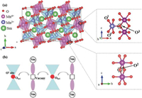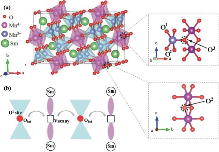 | Fig. 2. (a) Crystal structure of mullite SmMn2O5. The dashed circles denote two O sites with the lowest oxygen vacancy formation energy, named O3 and O2, respectively. Reproduced with permission [16]. Copyright 2017, Wiley-VCH. (b) Schematic view of the conduction mechanism of bridging oxygen atoms (Obri) in SmMn2O5. Reproduced with permission [17]. Copyright 2005, Wiley-VCH. | |