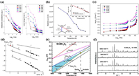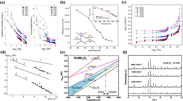 | Fig. 3. (a) Variation of dielectric constant (left) and loss tangent (right) as a function of frequency at various temperatures. Reproduced with permission [27]. Copyright 2020, IOP Science. (b) Change of resistivity as a function of temperature. Reproduced with permission [27]. Copyright 2020, IOP Science. (c) Variation of conductivity as a function of frequency. Reproduced with permission [27]. Copyright 2020, IOP Science. (d) Temperature dependence of the oxygen partial pressure for the thermal dissociation of SmMn2O5. Reproduced with permission [31]. Copyright 2007, Springer. (e) Thermal stability diagram of SmMn2O5 compounds. Reproduced with permission [33]. Copyright 2016, IOP Science. (f) XRD profiles of the SmMn2O5 (SMO) samples. Reproduced with permission [34]. Copyright 2016, Royal Society of Chemistry. | |