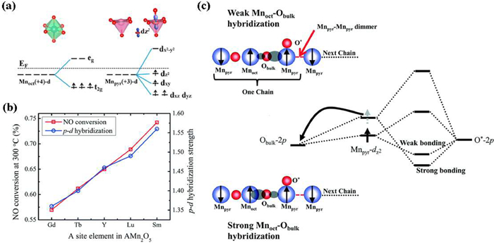 | Fig. 4. (a) The Mn-O octahedral and pyramidal crystalline fields, and the corresponding the d-orbital splitting configurations. Reproduced with permission [29]. Copyright 2018, Elsevier. (b) The pd hybridization strength versus the NO conversion rate. Reproduced with permission [36]. Copyright 2016, Royal Society of Chemistry. (c) Schematic diagram of the connection between the Mnoct-3d and Obulk-2p hybridization and the desorption of O*. The energy of the dz2 orbital could be modulated by the hybridization between Mnoct-3d and Obulk-2p, which consequently results in tunable bonding strength between Mnpyr and O*. Reproduced with permission [36]. Copyright 2016, Royal Society of Chemistry. | |