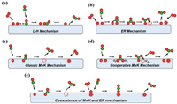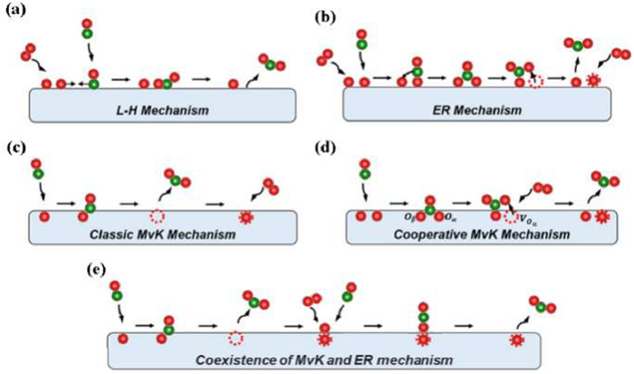 | Fig. 5. Schematic of NO oxidation reaction pathways with mechanisms of (a) L-H, (b) ER, (c) classic MvK, (d) cooperative MvK, Reproduced with permission [50]. Copyright 2021, Wiley-VCH. and (e) coexistence of MvK and ER. The green balls, red balls, and red dashed circles represent N atoms, O atoms, and oxygen vacancies, respectively. | |