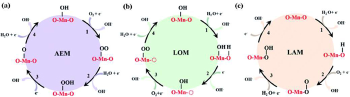 | Fig. 6. ORR mechanism diagrams with a comparison between (a) AEM, (b) LOM, and (c) LAM. The atoms marked in red represent the original atoms of the system, while the adsorbed substances are labeled in black. Reproduced with permission [38]. Copyright 2021, Royal Society of Chemistry. | |