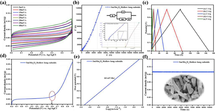 | Fig. 8. (a) CV, (b) EIS, (c) GCD, (d) LSV study, (e) Tafel slope and (f) CA study of mullite SmMn2O5 Hollow long cuboids. Reproduced with permission [74]. Copyright 2019, Elsevier. | |