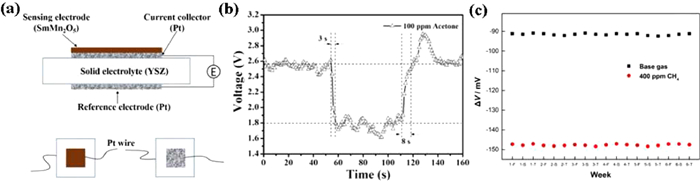 | Fig. 9. (a) Schematic diagram of the prepared sensor. Reproduced with permission [77]. Copyright 2020, Elsevier. (b) Response and recovery time of SmMn2O5 sample to 100 ppm acetone at 300 ℃. Reproduced with permission [76]. Copyright 2019, Elsevier. (c) long-term stability test of the sensor attached with SmMn2O5 sensing electrode. Reproduced with permission [77]. Copyright 2020, Elsevier. | |