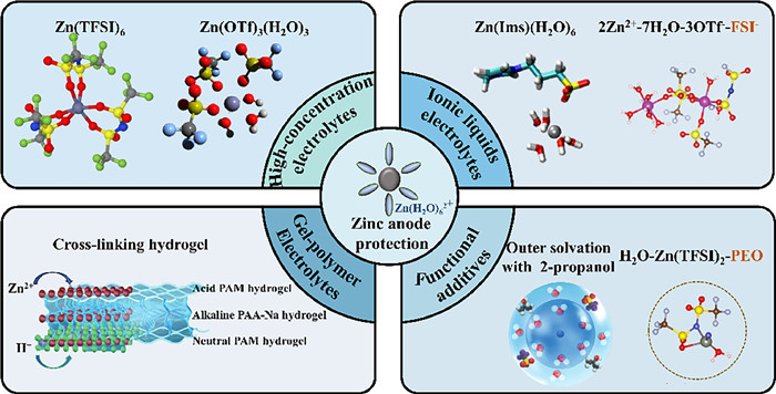 When zinc salts dissolve in water, water molecules spontaneously coordinate with zinc-ions to form hydrated zinc-ions [Zn(H2O)6 2+], in a commercial electrolyte, water molecules are relatively abundant. Zinc-ions attract six regularly arranged water molecules through a strong electrostatic potential field, while the arrangement of outer shell water molecules is partially ordered with an indefinite number. Therefore, the strategy of increasing solute concentration to expel water molecules from the solvation shell has emerged. As the concentration of electrolyte salts increases, the number of solvent water molecules decreases, and the distance between the cations and anions shortens, leading to the formation of what is known as water-in-salt electrolytes (WISEs). In highly concentrated states, cations and anions exist in pairs, resembling the characteristics of ionic liquids. Detailed discussions regarding ionic liquids will be presented in the next subsection. The effectiveness of artificial solid electrolyte interface layers (SEI) is demonstrated in metal batteries (magnesium metal batteries, sodium metal batteries and lithium metal batteries) [2,45,46]. Tens of anions and cations can induce the in-situ formation of a SEI, which stably protect the Zn anode during electrochemical stripping/plating, achieving corrosion inhibition and regulating cyclic stability. Particularly, highly concentrated electrolytes can effectively widen the narrow voltage window (1.23 V) limited by solvent water [47], there is potential to achieve higher energy density in zinc-based batteries.