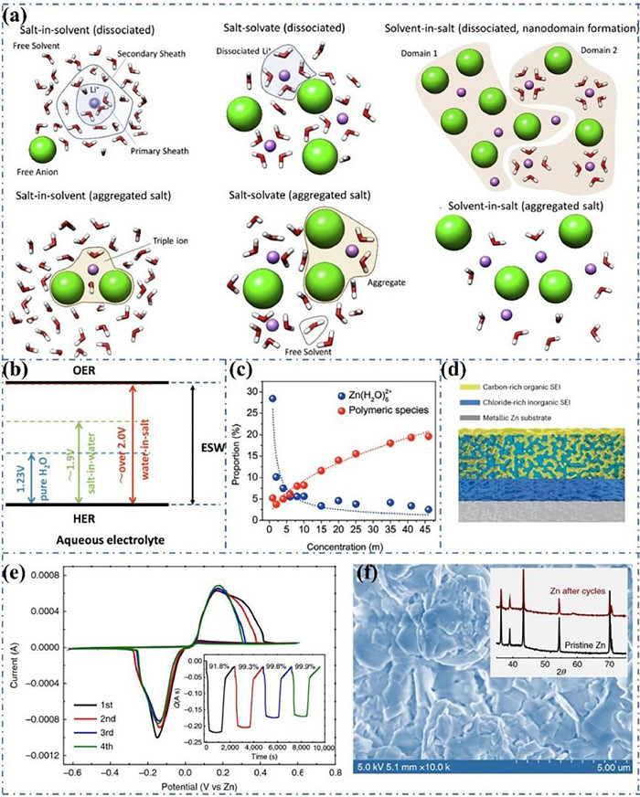 | Fig. 3. (a) Diagram illustrating different concentrations into three regimes for dissociating and aggregating salts. Reproduced with permission [18]. Copyright 2022, Elsevier. (b) The ESW of aqueous electrolytes at various concentrations. Reproduced with permission [11]. Copyright 2022, John Wiley and Sons. (c) Trends in the variations of Zn(H2O)6 2+ and polymeric species content in electrolytes ranging from 1 mol/L to 46 mol/L. Reproduced with permission [26]. Copyright 2021, John Wiley and Sons. (d) Schematic illustrating the structure of dual-layer SEI in the Zn anode with electrolyte of 30 mol/L ZnCl2 + 5 mol/L LiCl. Reproduced with permission [48]. Copyright 2023, Springer Nature. (e) Cyclic voltammogram illustrating the process of Zn stripping/plating in a three-electrode cell. Inset: Chronocoulometry curves. (f) Scanning electron microscope (SEM) image of the Zn anode after undergoing 500 stripping/plating cycles in 1 mol/L Zn(TFSI)2 + 20 mol/L LiTFSI electrolyte. Inset: X-ray diffraction (XRD) pattern. Reproduced with permission [49]. Copyright 2018, Springer Nature. | |