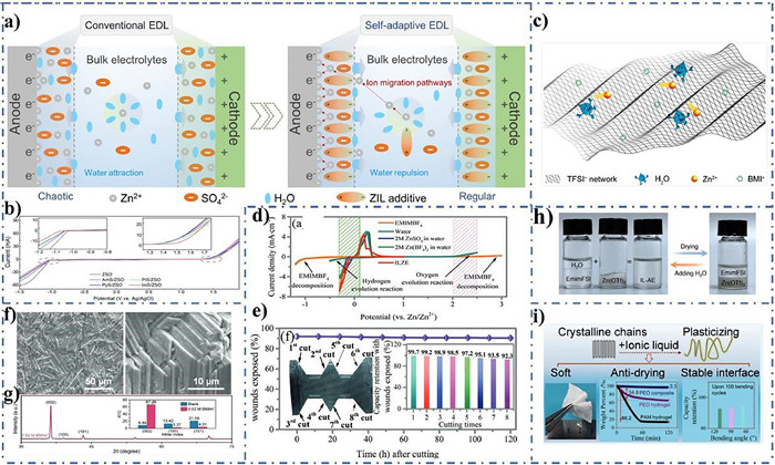 | Fig. 4. (a) Mechanism diagram of a self-adaptive electric double layer construction in ionic liquid additive electrolyte. (b) The ESW of basic electrolyte a series of zwitterionic ionic liquids additives in the electrolyte. Reproduced with permission [27]. Copyright 2022, Royal Society of Chemistry. (c) Schematic diagram of water locking network structure constructed by ionic liquids. Reproduced with permission [56]. Copyright 2023, American Chemical Society. (d) The ESW of basic electrolyte and EMIMBF4 ionic liquids additives electrolyte. (e) Capacity retention ratio of all-solid-state batteries with EMIMBF4 ionic liquid additives in the electrolyte under varying cutting times. Reproduced with permission [57]. Copyright 2020, John Wiley and Sons. (f) SEM images and (g) XRD of cycled Zn anodes morphology with 0.02 m BMIm+ additives electrolyte under 5 mA/cm2. Inset: Corresponding texture parameters of Zn anodes. Reproduced with permission [59]. Copyright 2022, John Wiley and Sons. (h) Digital images of the transformation of the initially immiscible H2O-EmimFSI binary system into a homogeneous solution through the incorporation of Zn(OTf)2, demonstrating ionic liquid acting as "water pocket". Reproduced with permission [28]. Copyright 2023, John Wiley and Sons. (i) Schematic illustrating ionic liquids optimized gel-polymer electrolyte for anti-drying and stable interface. Reproduced with permission [58]. Copyright 2022, American Chemical Society. | |