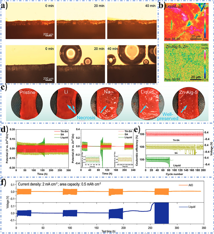 Luo et al. developed a polyzwitterionic hydrogel electrolyte (PZHE) with polar N and O groups, which immobilizes water molecules within the polymer framework. The polar groups effectively bind and retain water molecules [64]. Through in-situ optical microscopy observations, it was found that the Zn//Zn symmetric cell using PZHE exhibited significantly suppressed HER during electrochemical cycling (Fig. 5a), the reversibility of the Zn anode was improved (lifespan of over 3500 h under 0.5 mA/cm2), with a room temperature ion conductivity of 32 mS/cm and the Zn2+ migration number of 0.656. Otherwise, the gel polymer can lift up the resting performance with suppressed chemical corrosion, Zhou et al. used tannic acid-modified sodium alginate to obtain a hydrogel with carboxyl groups and phenolic hydroxyl groups, which interact with Zn2+ ions [65]. Specifically, the zinc anode and its matched cathode have conflicting requirements for water molecules. In the zinc anode, corrosion can be suppressed by reducing the number of water molecules, while most cathodes require co-intercalation of protons and Zn2+ to achieve high capacity and high rate capability [66]. The synergies of reduced water content and zinc-philic ligand leads to uniform zinc deposition and improved shelf performance (Fig. 5d). The improved reversibility of the zinc anode was also confirmed in a Zn//Cu asymmetric cell (Fig. 5e) [63]. The gel-polymer electrolytes as well exhibit the potential in crossover fields. A hierarchical alginate hydrogel developed that simultaneously inhibits corrosion and byproducts (Fig. 5b). Through validation in the rabbit intestinal tract, the hydrogel demonstrated biocompatibility for zinc battery applications (Fig. 5c) [67]. It exhibited excellent safety and enhanced the potential for zinc battery applications in wearable devices and biomedicine. The unique self-healing properties of hydrogels compared to liquid electrolytes can enhance the stability of the entire battery system (Fig. 5f) [68].
