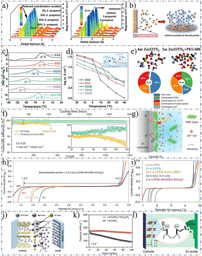 | Fig. 6. (a) Study the solvation structure of Zn2+ with alcohol organic additives. synchrotron-radiation extended X-ray absorption fine structure (EXAFS) spectra for electrolytes. Reproduced with permission [98]. Copyright 2022, John Wiley and Sons. (b) Schematic diagram of the mechanism of SEI formation with N, N-dimethylformami-dium trifluoromethanesulfonate (DOTf) additives electrolytes. Reproduced with permission [120]. Copyright 2022, Elsevier. The performance of electrolytes at low temperatures by incorporating ethylene glycol additives: (c) Freezing point data from differential scanning calorimetry (DSC) curves and (d) the ionic conductivities of hybrid electrolytes at different temperatures. Inset: regulation mechanism. Reproduced with permission [100]. Copyright 2020, Royal Society of Chemistry. (e) Zn2+ Solvation structure and component content of 4 mol/L Zn(OTf)2, and 4 mol/L Zn(OTf)2 + PEG400 additives electrolyte. Reproduced with permission [107]. Copyright 2022, American Chemical Society. (f) Coulombic efficiency of Zn//Cu cells with and without long-chain polyethylene oxide (PEO) polymer additive electrolytes. (g) The Schematics of the mechanism PEO regulating Zn deposition behavior. Reproduced with permission [95]. Copyright 2020, John Wiley and Sons. (h) Linear sweep voltammetry tests of electrolyte with different concentrations of PEO and (i) different types electrolytes. Reproduced with permission [94]. Copyright 2020, Springer Nature. (j) Schematic diagram of the way MgSO4 additive electrolyte alleviating the dissolution of cathode MgxV2O5·nH2O. Reproduced with permission [113]. Copyright 2020, Springer Nature. (k) Cycling performance of Zn//NaV3O8·1.5H2O (NVO) full batteries with and without Na2SO4 additives electrolytes. (l) Schematic diagram of the way Na2SO4 additives inhibits Zn dendrites and the breakdown of NVO nanobelts. Reproduced with permission [109]. Copyright 2018, Springer Nature. | |