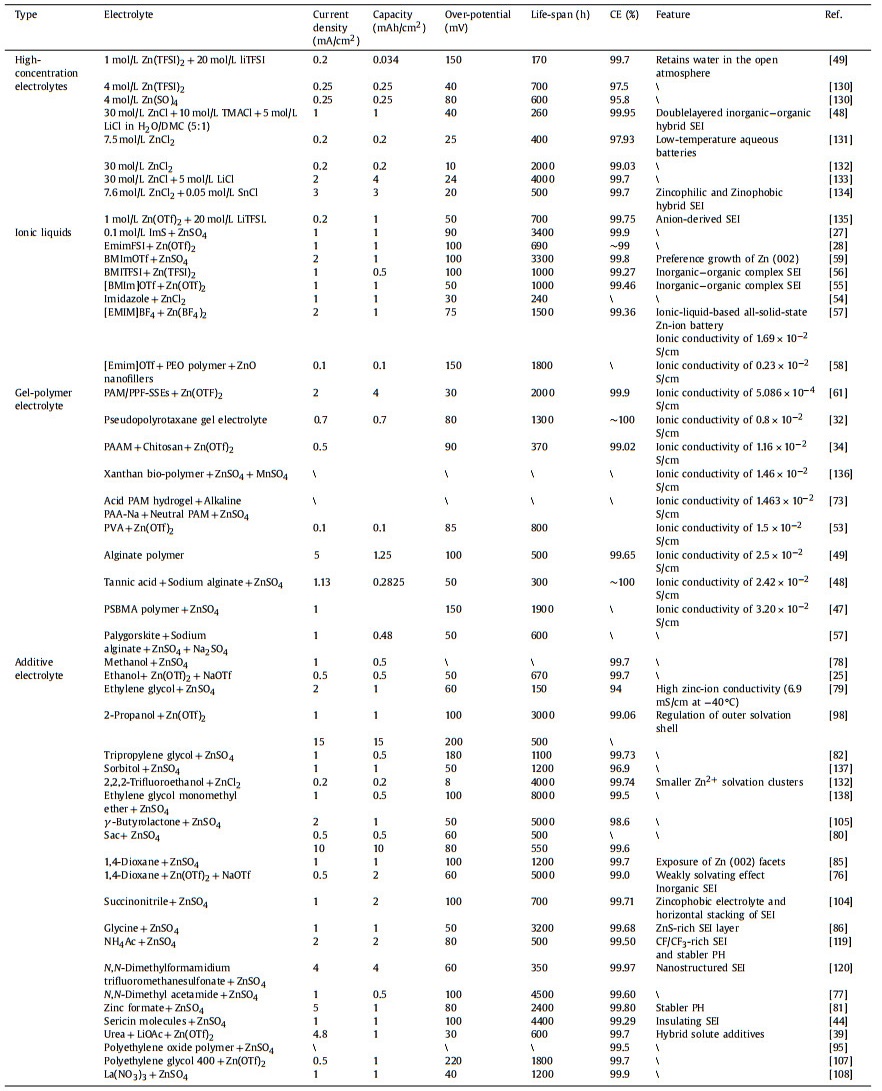 4. Conclusion and perspectivesIn summary, the instability of the zinc anode in the electrolyte is caused by the polarization of active water molecules on the zinc anode surface, resulting in issues such as zinc dendrites, hydrogen evolution corrosion, byproduct formation, and passivation. These problems are mutually reinforcing, leading to a vicious cycle and severe deterioration of the performance of aqueous zinc-ion batteries. To control the polarization of active water molecules on the zinc metal surface, effective strategies in electrolyte regulation engineering include: (1) Eliminating water from the solvation shell of Zn2+; (2) forming hydrophobic films on the zinc anode surface; (3) designing stable SEI structures to block protons from reaching the zinc surface; and (4) inducing the texture growth of Zn (002). To sum up, a number of recently reported water molecules regulation strategies are shown in Table 1 [25,27,28,32,34,39,44,47-49,53-59,61,73,76-78,80-82,85,86,95,98,104,105,107,108,119,120,130-138].