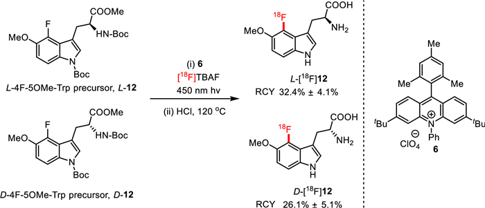 The synthesis of tryptophan-based PET ligands, which have great potential to monitor tryptophan metabolism in various diseases, has been hampered by complicated synthetic procedures. Most recently, Li, Moschos and co-workers provided a novel and facile method to prepare [18F]F-5-OMe-tryptophans via photoredox aromatic radiofluorinantion under mild reaction conditions, by which enantiopure precursors and PET tracers can be directly prepared without racemization [56]. As displayed in Fig. 10, using [18F]TBAF as the radiolabeling reagent, and acridinium 6 as photocatalyst, [18F]F-5-OMe-tryptophans L-[18F]12 and D-[18F]12 were easily generated from the corresponding precursor in the solution of DCE/t-BuOH/MeCN under light (450 nm) irradiation. These tryptophan-based PET ligands were obtained in high radiochemical yields of 2.6% ± 0.5% and 32.4% ± 4.1%, respectively.