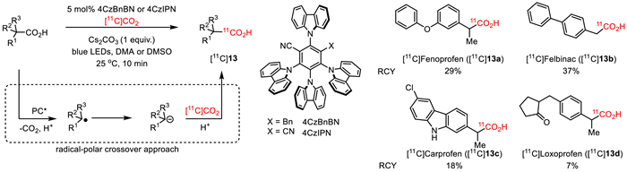 3.1. Photocatalytic 11C-carboxylationGiven the prevalence of carboxylic acids in various pharmaceuticals and natural products, the direct CO2 group exchange offers an opportunity for simple and cost-effective radiolabeling of carboxylic acids. Towards this end, Lundgren, Rotstein and co-workers disclosed an organo-photoredox catalytic direct exchange of CO2 groups of carboxylic acids without the need of high temperatures or prior carboxylate activation [60]. As depicted in Fig. 11, using 4CzBnBN as a photocatalyst, Cs2CO3 as a base, DMA (dimethylacetamide) as a solvent, a broad range of aliphatic carboxylic acids readily underwent fast carbon isotope exchange with [11C]CO2 under mild conditions. This reaction involves a radical-polar crossover process contributed by the low-barrier C—CO2 bond cleavage initiated by carboxylate single-electron oxidation and the following effective recombinantion of carbanion intermediates with [11C]CO2 [61]. A wide range of substrates, including pharmaceutical carboxylic acids and precursors, were tolerated by this reaction. For example, in the presence of 4CzBnBN and Cs2CO3 in DMA, 11C-labeled drug molecules [11C]Fenoprofen ([11C]13a), [11C]Felbinac ([11C]13b), [11C]Carprofen ([11C]13c), and [11C]Loxoprofen ([11C]13d), were successfully prepared by the radiolabeling of corresponding precursors with [11C]CO2 in moderate to good RCY (7%−37%), following 10 min of LED irradiation. [11C]Fenoprofen could be achieved in a lower RCY (9.5%) with a molar activity reaching 0.029 GBq/µmol, when the reaction time was increased to 20 min. It was worth mentioning that this approach is appliable to substrates that were neither tolerated by the transition-metal-catalyzed degradation−reconstruction nor by the thermally induced reversible decarboxylation.