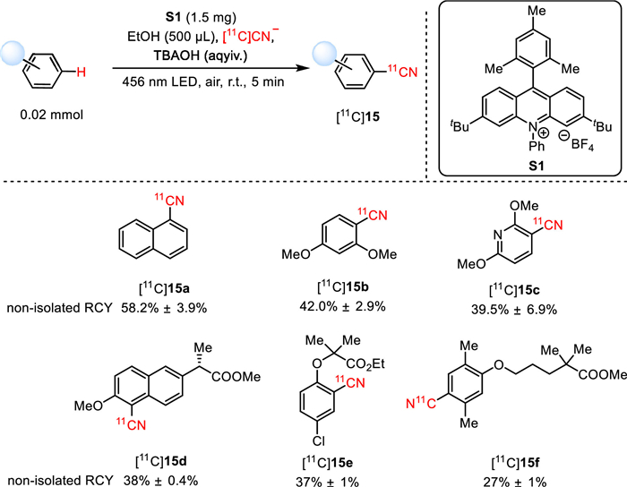 The development of facile approaches to 11C-cyanation of aromatic molecules has attracted great attention due to the ubiquity of aromatic nitriles in pharmaceuticals, natural products, pigments, agrochemicals and herbicides [62-64]. Conventional approaches to 11C-aryl nitriles typically suffer from use of transition metals, high temperature, tedious precursor synthesis, and complicated operation [64]. To address these limitations, several mild and effective photocatalytic 11C-cyanation reactions of aromatic scaffolds have been successfully developed [59,65].