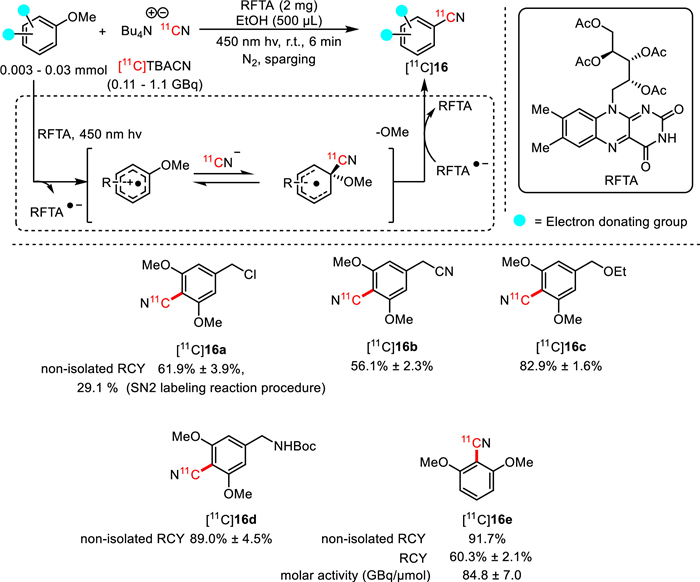 Further in 2023, Li, Nicewicz, and co-workers took advantage of the cation-radical-accelerated SNAr to accomplish 11C-cyanation of electron-rich methoxyarenes via metal-free photocatalysis [65,66]. 11C-cyanation of a wide range of electron-rich methoxyarenes, including super electron-rich substrates, were achieved in excellent non-isolated RCYs (Fig. 14). A particularly compelling characteristic of this photocatalytic approach resided in its different chemo-selectivity from a typical SN2 radiolabeling method. With benzylic chloride as substrate, while the thermal SN2 radiolabeling conditions provided benzylic [11C]nitrile ([11C]16a) in 29.1% non-isolated RCY, the photocatalytic [11C]cyanation conditions provided [11C]16a in 61.9% non-isolated RCY without any benzylic [11C]nitrile product. Additionally, the relatively low precursor loading (0.003–0.03 mmol) also simplified the process for radioligand purification. Notably, excellent molar activity could be achieved to fulfill the demand for translational use in humans (84.8 ± 7.0 GBq/mmol for [11C]16e). It was hypothesized that the cation radical intermediates generated from the corresponding aryl ether substrates might play an important role in this reaction by accelerating the nucleophilic aromatic substitution involving TBA+[11C]CN−.