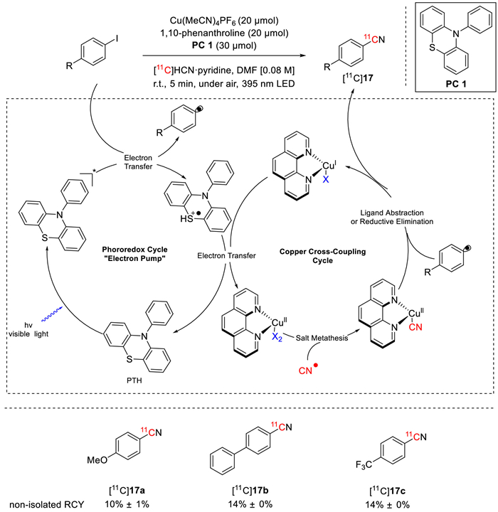Also in 2023, Scott's group developed a novel and efficient copper-mediated photo-catalytic system for the radiocyanation of aryl iodides in remarkably mild reaction conditions [67]. As shown in Fig. 15, in the presence of Cu(MeCN)4PF6, 1,10-phenanthroline, 10-phenylphenothiazine (PC 1), and [11C]HCN·pyridine in DMF, irradiated with 395 nm LEDs, [11C]cyanation of aryl iodides were feasible at room temperature under air in 5 min, providing expected products [11C]17a-17c in good non-isolated RCYs (10% ± 1% for [11C]17a, 14% ± 0% for both [11C]17b and [11C]17c). The underlying mechanism has been proposed (Fig. 15). Aryl radicals were first generated from aryl iodides via copper-mediated visible-light photoredox catalysis with PC-1. The aryl radicals were then captured by a Cu-11CN species to achieve aryl-11CN coupling, which finally arrived at the expected product.