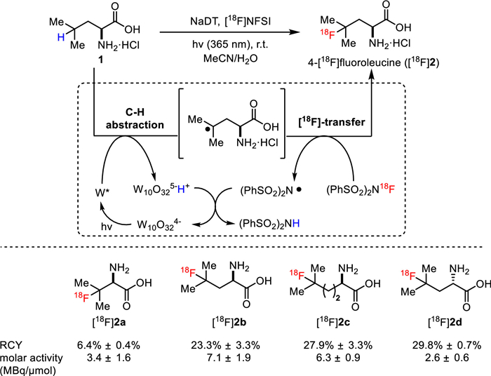 2.1. Photocatalytic aliphatic 18F-fluorinationBritton and co-workers have been devoted to developing effective photocatalytic systems for the (radio)fluorination of aliphatic amino acids and peptides [40]. In 2017, they disclosed a mild and photocatalytic direct C−H 18F-fluorination reaction to selectively radiolabel branched aliphatic amino acids at the tertiary C−H bond sites [23]. As displayed in Fig. 2, with electrophilic [18F]-N-fluorobenzenesulfonimide ([18F]NFSI) as the radiofluorinating reagent, a mixture of H2O and MeCN as the co-solvent system, sodium decatungstate (Na4W10O32, NaDT) as the photocatalyst under UV light (365 nm) irradiation, several 18F-labelled amino acids [18F]2a-2d were obtained in moderate to good RCY ranging from 6.4% to 29.8% despite with low molar activity (2.6–7.1 MBq/µmol) due to the use of electrophilic [18F]NFSI. This reaction displayed sufficient synthesis time (50 min) compared to the half-life decay of fluorine-18 (110 min), which suggested the potential of this radiolabeling method for the preparation of 18F-labeled branched amino acids. More importantly, this approach obviates the conventional implementation of prosthetic groups as well as the complicated synthesis of precursors [41]. This reaction was proposed to be initiated by a hydrogen atom transfer (HAT) from amino acids to the photoactivated decatungstate catalyst [42,43], generating a tertiary carbon radical. Subsequent 18F-fluorine atom transfer proceeded in the presence of [18F]NFSI to arrive at the desired 18F-labeled amino acids. Notably, 18F-labeled and native amino acid mixture could be purified from other impurities with strong cation exchange resin, and directly used without further purification with high performance liquid chromatography (HPLC), since the low plasma concentrations ranging from 100 µmol/L to 150 µmol/L of native amino acids was unlikely to interfere with the pharmacokinetic effect of the 18F-labeled amino acids.